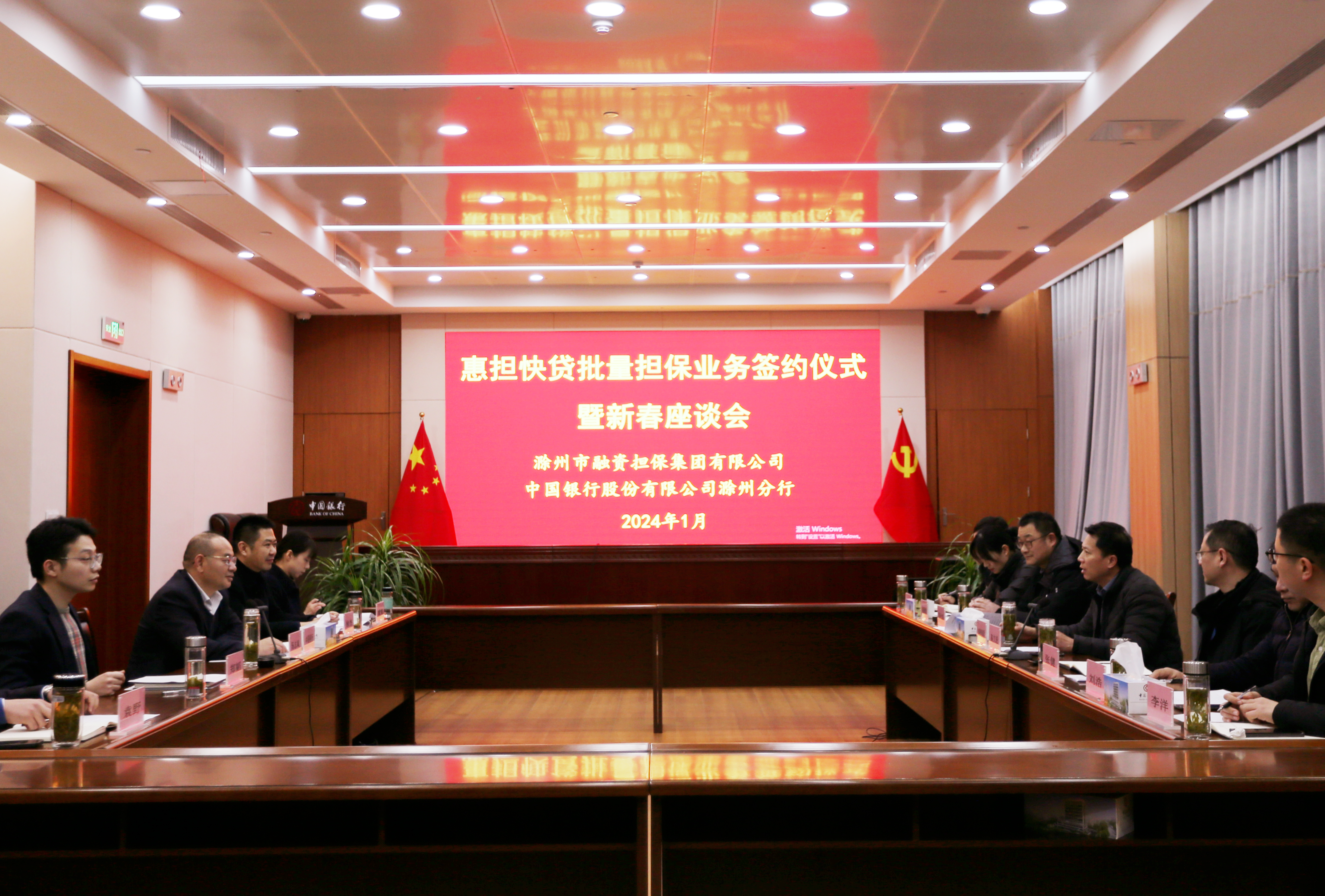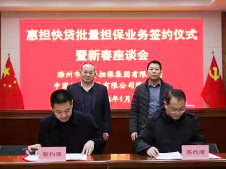 1月18日下午,滁州市融資擔(dān)保集團(tuán)有限公司與中國銀行滁州分行舉行“惠擔(dān)快貸”批量擔(dān)保業(yè)務(wù)簽約儀式暨新春座談會。市擔(dān)保集團(tuán)黨委書記、董事長、總經(jīng)理高文進(jìn),中國銀行滁州分行黨委書記、行長湯志斌出席簽約儀式,雙方業(yè)務(wù)部門負(fù)責(zé)人以及企業(yè)代表參加。集團(tuán)黨委委員、副總經(jīng)理張健與市中行黨委委員、副行長徐杰代表雙方簽署合作協(xié)議。